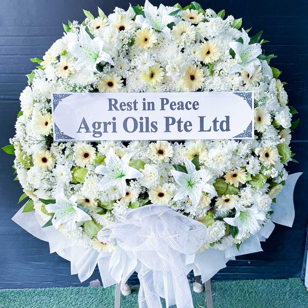 พวงหรีดดอกไม้สดสีขาวครีม รหัส P01 โทนสีขาว ครีม และเขียวอ่อน มาพร้อมดอกลิลลี่แซมกลางพวง สื่อถึงความสงบและความเคารพอย่างแท้จริง เหมาะสำหรับแสดงความอาลัยในงานศพที่ต้องการความเรียบหรูและนุ่มนวล จัดวางบนขาตั้งพร้อมโบว์ขาวสุภาพ ราคา 3,000 บาท รวมค่าจัดส่งถึงวัดในเขตกรุงเทพฯ