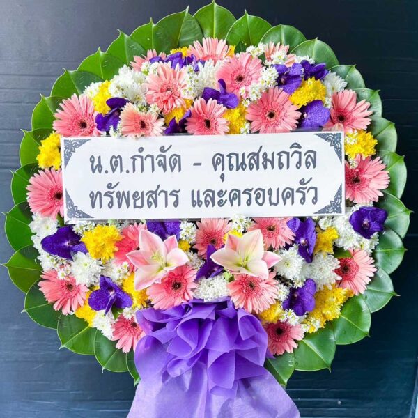 พวงหรีดดอกไม้สด สีชมพู ม่วง เหลือง รหัส M02 – หรูหรา สดใส มีชีวิตชีวา