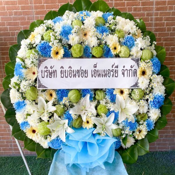 พวงหรีดดอกไม้สดสีฟ้า ขาว เขียว รหัส XL08